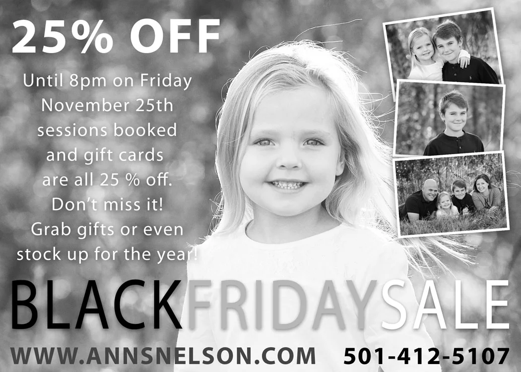 Yup! Running a black Friday special from now until I am planning to get ready for bed on black Friday. 8pm deadline because you KNOW I will be up all night the night before hitting the sales! Just finished editing a gorgeous family's 20 image mini digital session. This was down in Burns Park in North Little Rock. Early morning light is always gorgeous!