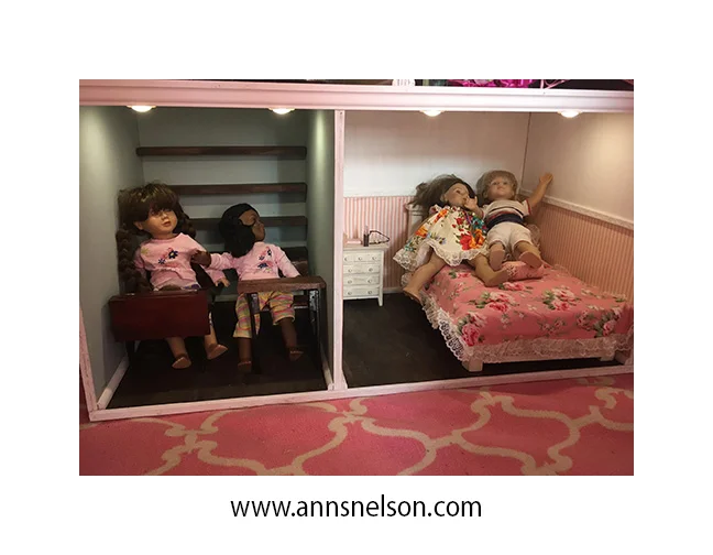 So how you ask was this monstrosity born? Well ok I was going to trade someone for a store bought one, but I am actually glad that did not occur. The store bought ones are 4ft 11 inches wide and 6ft tall and would not have fit into their room. So it would have ended up living in an area I would not have preferred so building custom turned out for the best. Plus I am not really into the pointed roof dollhouse setup with an upper floor you can only half use and all that wasted space.. We designed and built ours to have a roof space like an old downtown building and put their little café up there! Rooftop café !